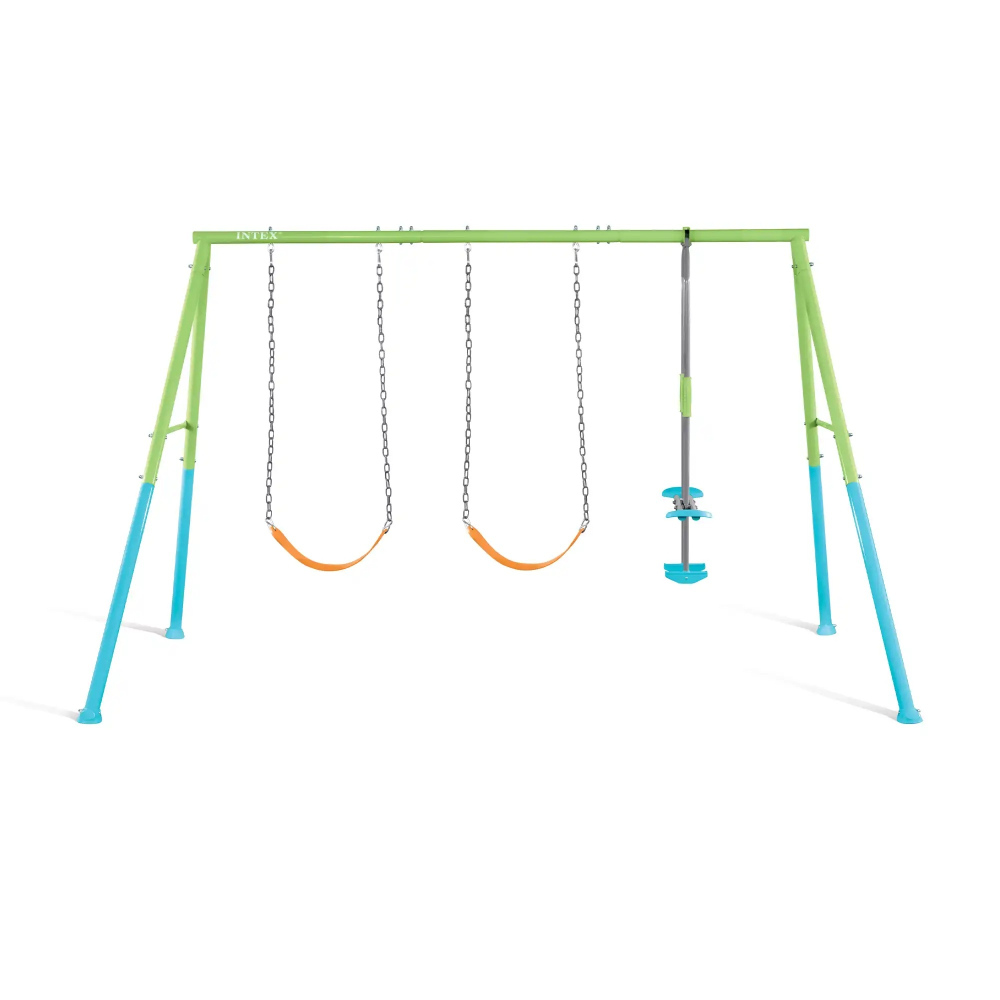 Intex představuje sady houpaček Swing! Nové Swing & Glide sety jsou sestaveny z robustních práškem lakovaných a pozinkovaných trubek z oceli o průměru 6 cm. Při vývoji výrobku byl kladen důraz na robustní rám pro zajištění maximální bezpečnosti při používání. Precizně navržený ukotvovací systém se snadno instalovatelnými patkami zajišťuje vynikající stabilitu a bezpečnost při používání. Tento barevný model je dodáván s výškově nastavitelnou houpačkou a dvojitou houpačkou.