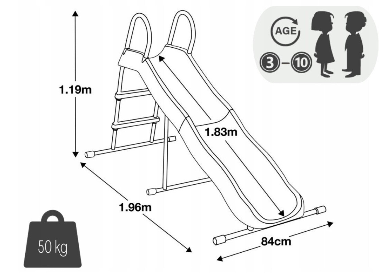 - Rozměry skluzavky: 1.96m x 84cm x 1.19m