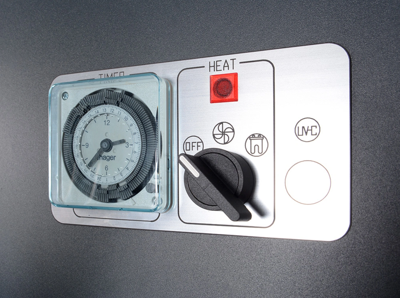 Je vybaven časovačem pro programování spuštění a termostatem pro nastavení teploty vzduchu na výstupu ze sušičky. Ovládání je velmi jednoduché a intuitivní.