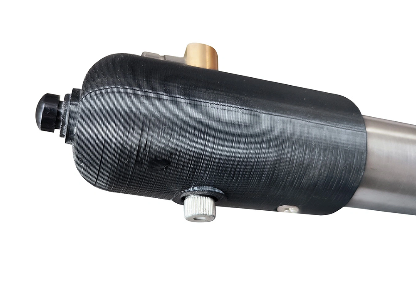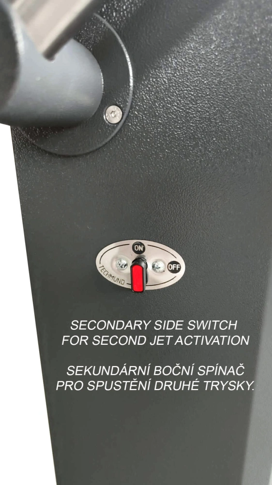 Trysky se aktivují zatlačením na spínač umístěný na konci pravého ramene.